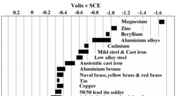 This is showing the galvanic series, it ranks the common metals by there tendency to corrode. You can see magnesium is very low and then Zinc, Beryllium and aluminum. You can see that zinc is more corrosive than aluminum but not by a substantial amount. This means that the OEM zinc anodes in the block are unable to effectively remove the charge from the thermostat because they are too far away which makes them high resistance.